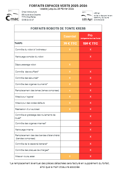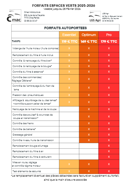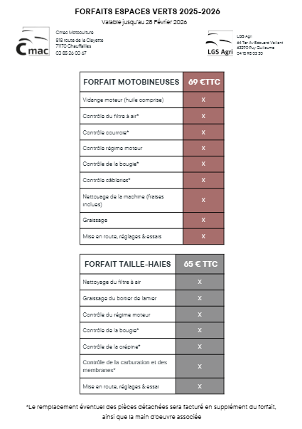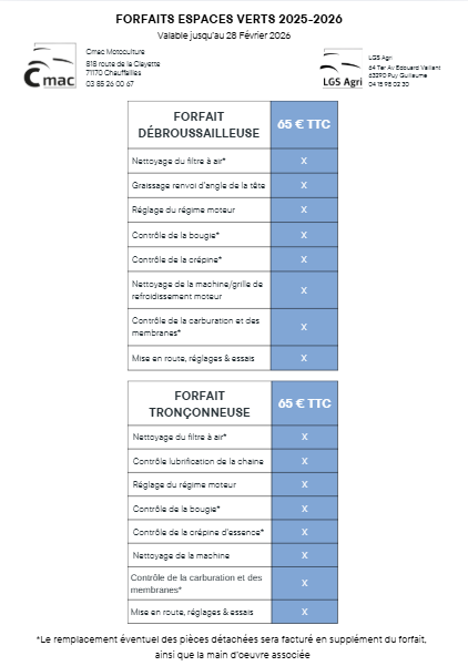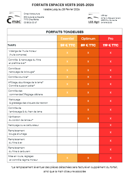 Nos forfaits Révisions Motoculture hiver 2025 pour tondeuses, robots de tonte, débroussailleuse. Cmac Chauffailles et LGS Agri Puy Guillaume